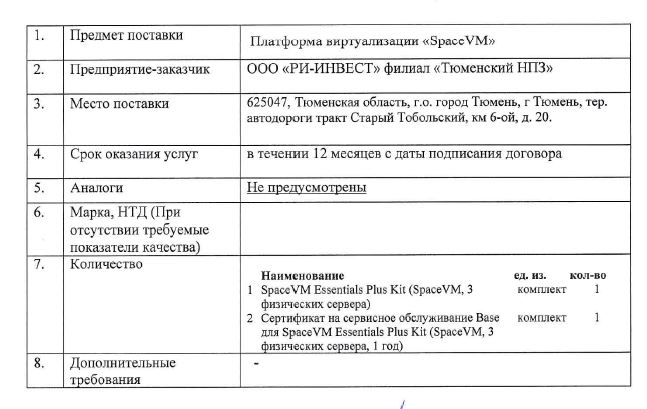 Поставка платформы визуализации «SpaceVM» для нужд филиала «Тюменский НПЗ» (г. Тюмень) без рассмотрения аналогов
